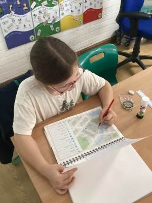We then looked at using four-figure grid references and keys to describe the location of objects and places on a map, before discovering that in a four-figure grid reference, the two digit eastings come first, followed by the two digit northings. We used four-figure grid references to locate a square on a map.