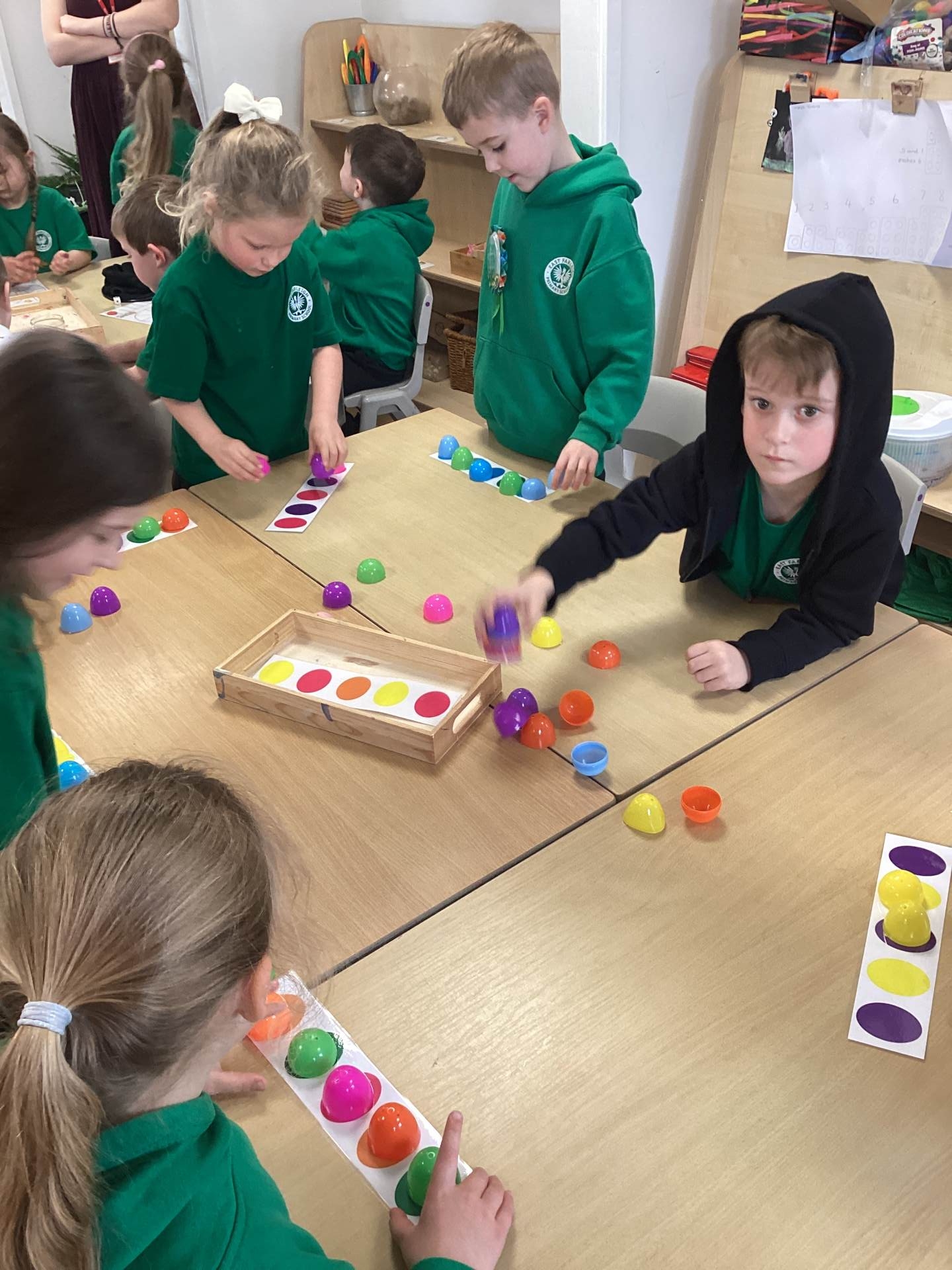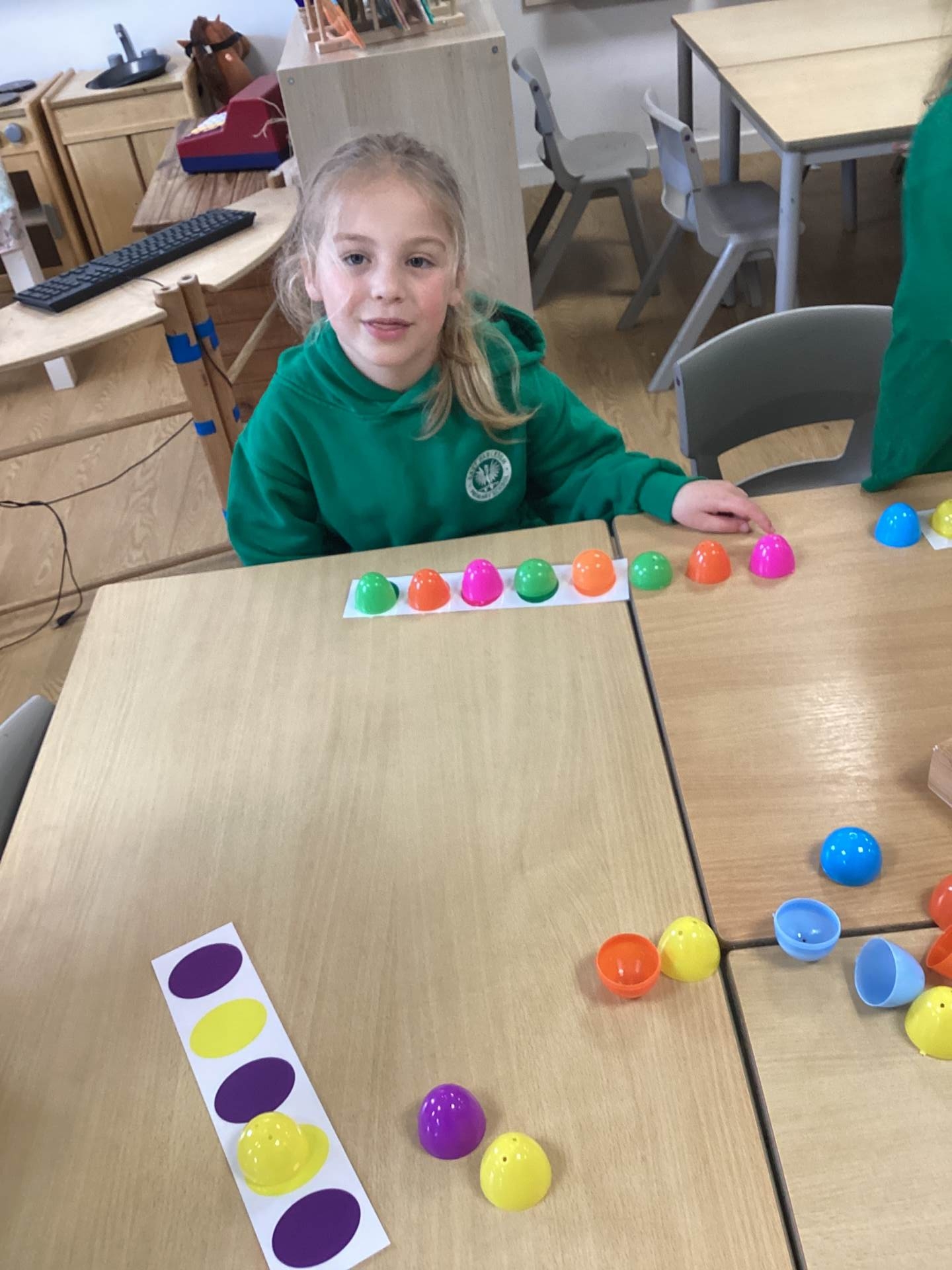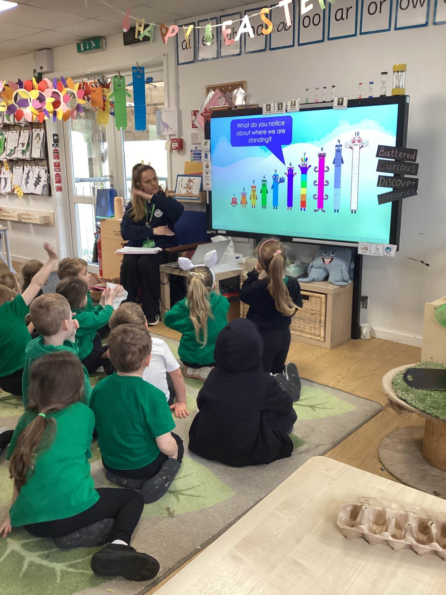 In Maths, we brought our learning to life using bunnies, chicks, and Easter eggs to support our understanding. The children used colourful eggs to create repeating patterns, showing great attention to detail and creativity. We also explored the concepts of “more than” and “less than” while sharing out Easter eggs, helping to build early number skills in a fun and engaging way.
