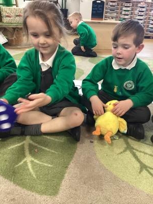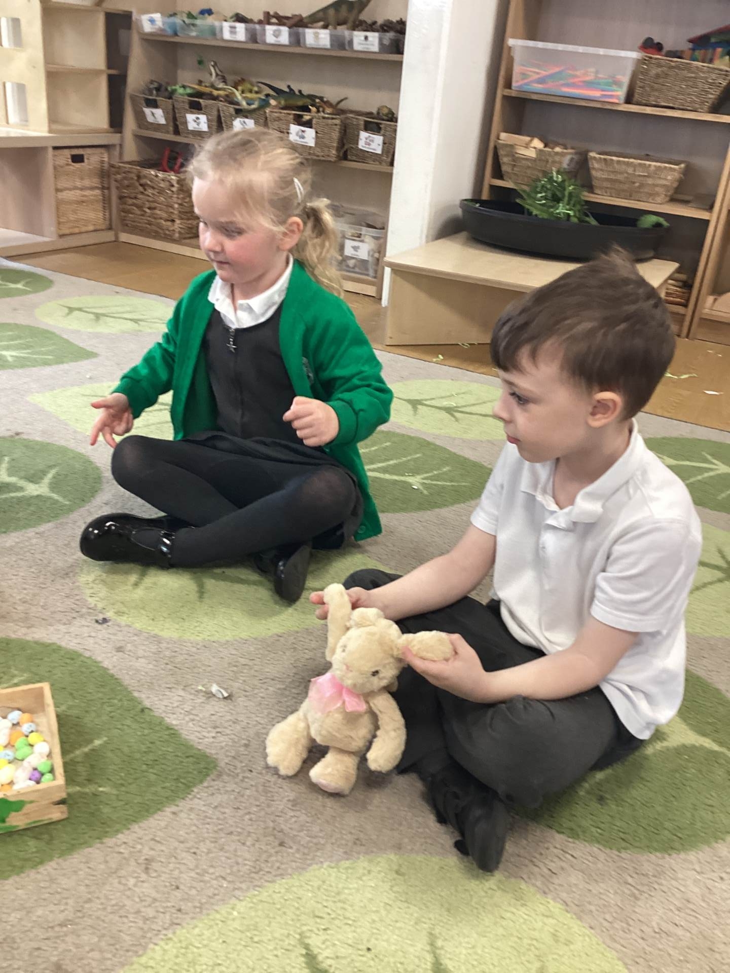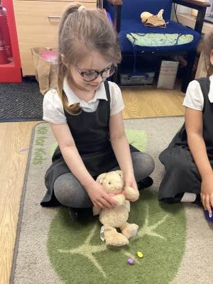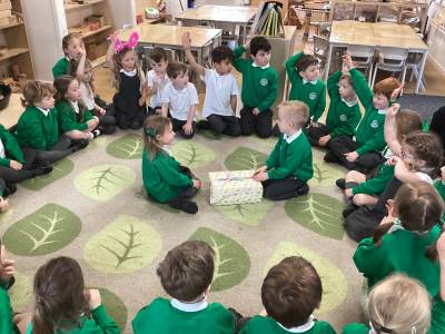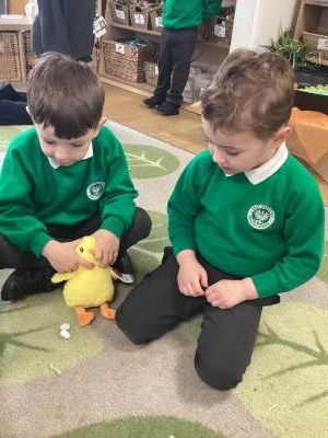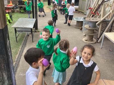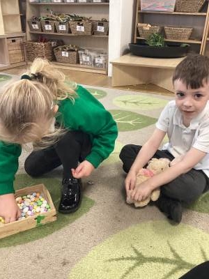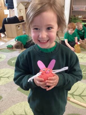 One of the most exciting moments of the week happened when we returned from PE on Monday to discover a beautiful gift and a letter waiting for us in the classroom—it had been left by the Easter Bunny! The letter asked the children to write back with their guesses about what might be inside the mysterious gift, and this became a focus for our writing throughout the week. The excitement built each day until Thursday, when we finally opened it together. To our surprise, no one had guessed correctly! Inside was a puzzle, which we worked together to complete, revealing the message: “It’s time for an egg hunt!” We rushed out into the garden where plastic eggs were hidden all around. The children helped one another to find an egg each and were delighted to enjoy a special Easter treat with their snack. It was such a magical and memorable surprise from the Easter Bunny!