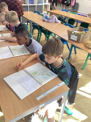 We then looked at using four-figure grid references and keys to describe the location of objects and places on a map, before discovering that in a four-figure grid reference, the two digit eastings come first, followed by the two digit northings. We used four-figure grid references to locate a square on a map.
